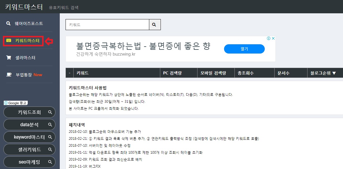 http://whereispost.com에 접속하여 왼쪽 메뉴 중 키워드마스터를 클릭한다.