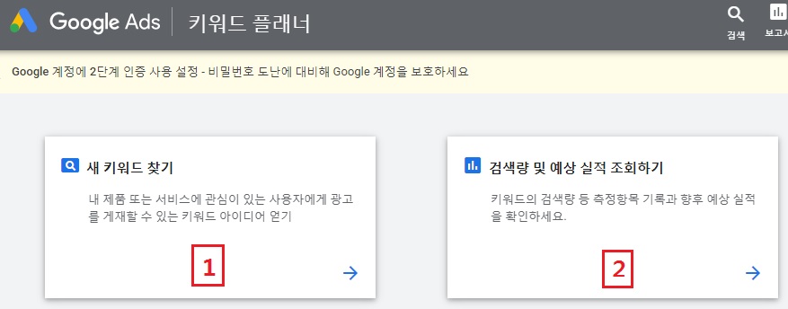 구글 애드워즈 키워드 플래너를 실행한다.