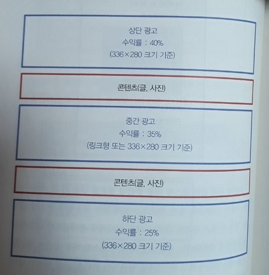 저자의 경험상 티스토리 블로그 포스팅 내용 중간에 광고를 넣을 때 가장 수익률이 좋았고 광고 크기는 336 x 280 이었다고 한다. 구글 애드센스로 돈벌기위한 방법으로 포스팅 하단보다는 상단에 광고를 집중시키는 것이 좋았다고 한다.