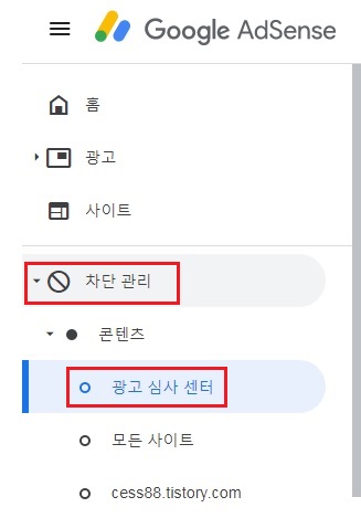 애드센스 광고와 포스팅 글의 맥락을 매칭시키면 클릭률이 높아진다고 한다. 구글 애드센스의 광고심사센터를 활용해서 불필요한 광고를 차단하면 좀 더 포스팅 내용과 일치하는 광고를 송출할 수 있다. 구글 애드센스에 접속해서 [차단관리] 하위 메뉴인 [광고 심사 센터]에서 할 수 있다.