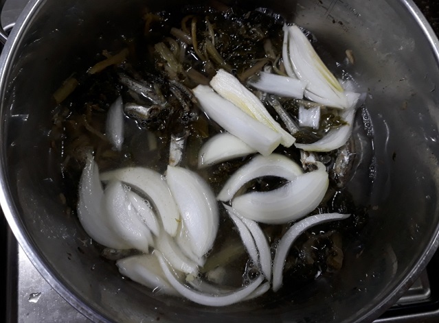 채소수를 자작하게 붇고 양파를 듬뿍 넣어 단맛을 낸다.