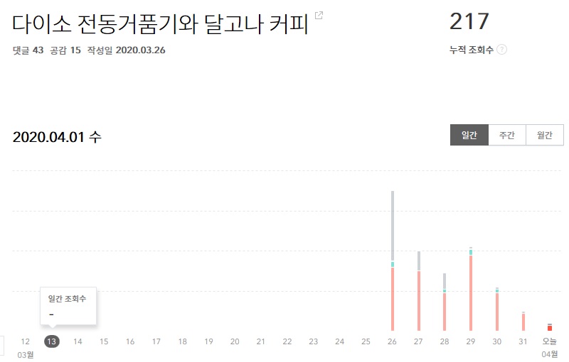 내가 직접 포스팅한 날짜가 3월 26일인데 총조회수 217회에
