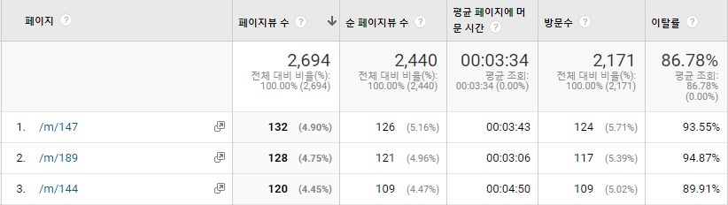 구글 애널리틱스 보고서를 자세히 보면 개별 포스팅 당