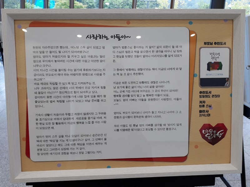 로비에 세명대학교 재학생 자녀를 둔 부모님들의 편지글이 전시되어 있었습니다.
