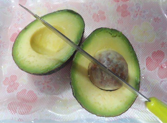 (주의! 아보카도를 조리대 위에 놓고 칼로 찍습니다.