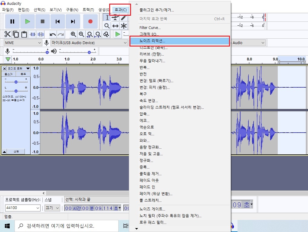 오다시티 메뉴 중 [효과]-[노이즈 리덕션]을 클릭합니다.