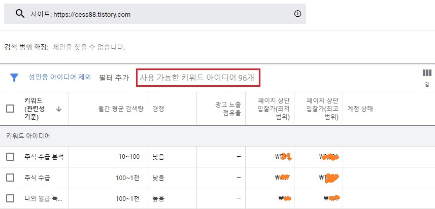 사용 가능한 키워드 아이디어가 96개라고 나옵니다.
