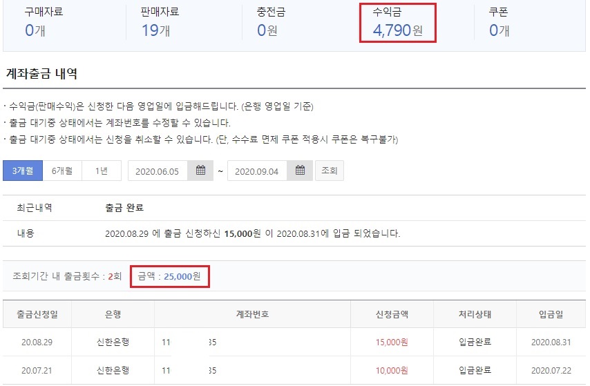 제 통장으로 25,000원을 출금했고, 잔액이 4,790원입니다