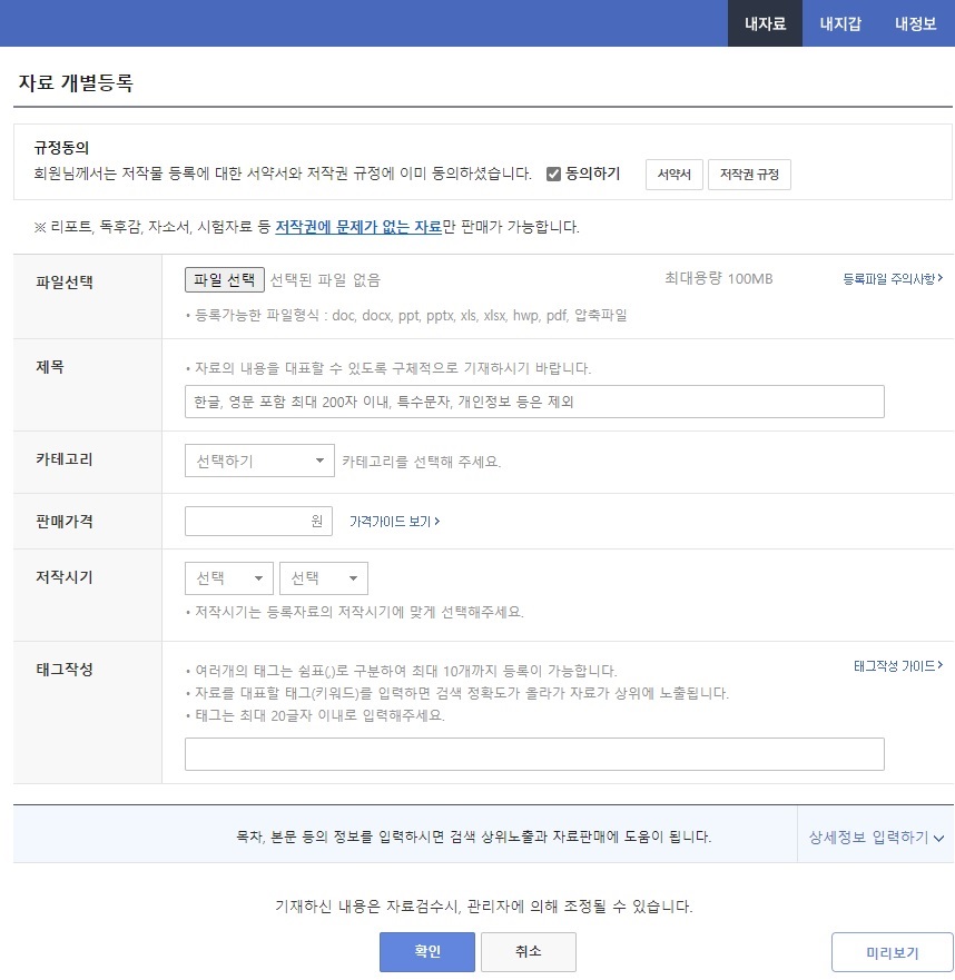 마이페이지에 가서 자료등록하기를 하면 됩니다.