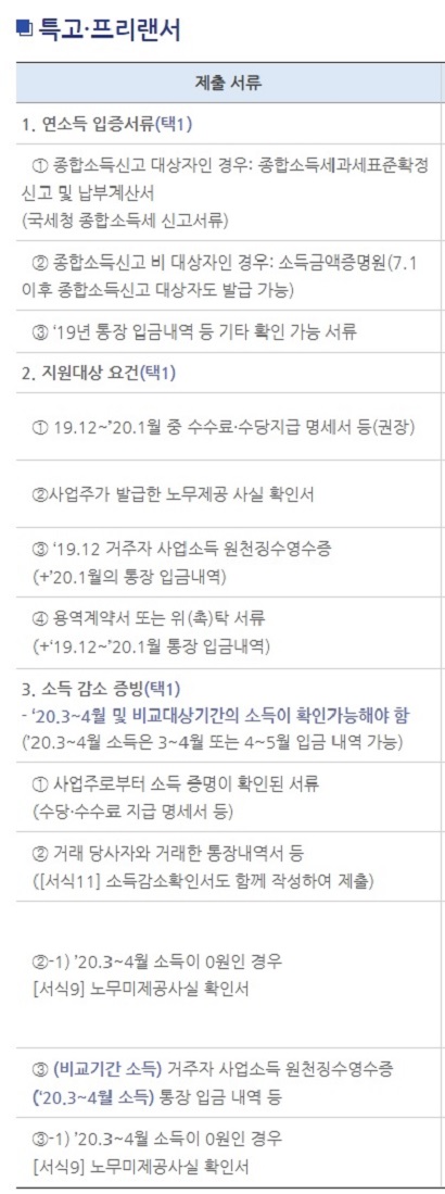 - ’20.1월부터 특고·프리랜서로 활동한 경우 1월 중 5일 이상의 노무 또는 25만원 이상의 소득이 발생했다면 지원대상에 포함