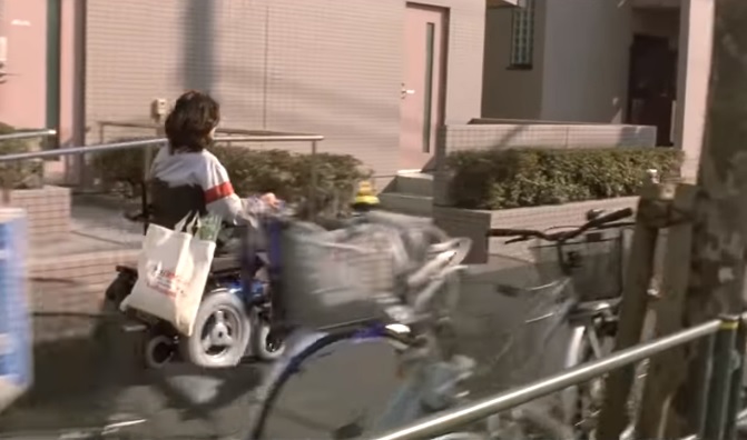 전동휠체어를 타고 혼자 외부활동을 합니다.