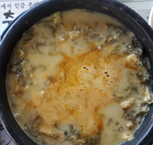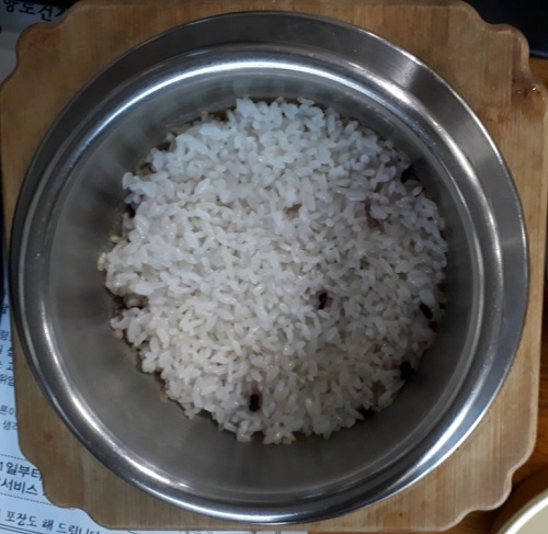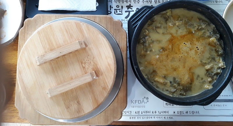 뚝배기에 푸짐하게 담긴 추어탕과 솥밥이 서빙 되었습니다. 솥밥을 제공된 밥그릇에 담은 후 물을 부어 놓았습니다. 저는 직접 끓이면서 국물을 많이 졸인 후 진하게 먹는 방법을 좋아하는데 미식가인 도반은 남원추어탕이 입맛에 맞다고 합니다.
