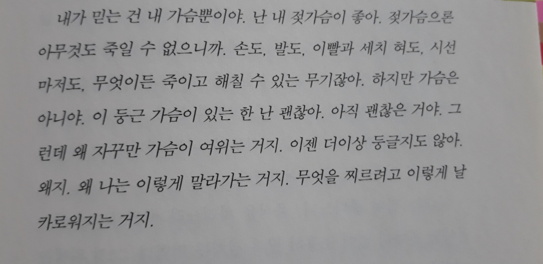 영혜는 늘 명치에 뭔가 걸려 있는 거 같아서 브래지어를 하지 않았습니다. 영혜언니의 시선으로 서술되는 ‘나무 불꽃’에서 영혜가 아버지의 폭력에 가장 큰 피해자라는 걸 알게 됩니다. 삼남매 중 가장 많이 매를 맞았다는 영혜. 어두워 오는 저녁에 불안하게 서성이던 어리고 여린 영혜.