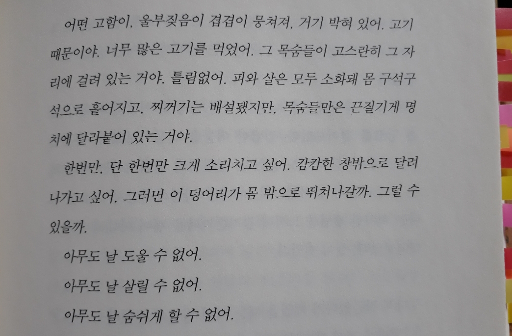 ‘어떤 고함이, 울부짖음이 겹겹이 뭉쳐져, 거기 박혀 있어. 고기 때문이야. 너무 많은 고기를 먹었어. 그 목숨들이 고스란히 그 자리에 걸려 있는 거야. 틀림없어. 피와 살은 모두 소화돼 몸 구석구석 흩어지고, 찌꺼기는 배설됐지만, 목숨들만은 끈질기게 명치에 달라붙어 있는 거야.’