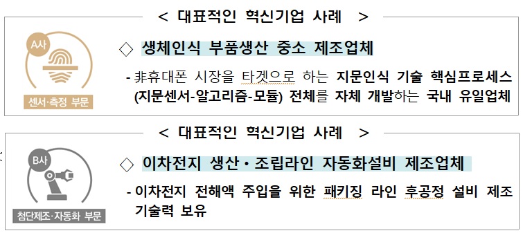생체인식 부품생산 중소 제조업체 등 총 78개 기업, 이차전지 생산·조립라인 자동화 설비 제조기업 등 총 65개 기업, 인공지능(AI)머신비전 솔루션 제공기업 등 총 40개 기업, 레이저 채혈 제조기업 등 총 34개 기업, 친환경 선박관리 서비스 기업 등 총 30개 기업을 선정했습니다.
