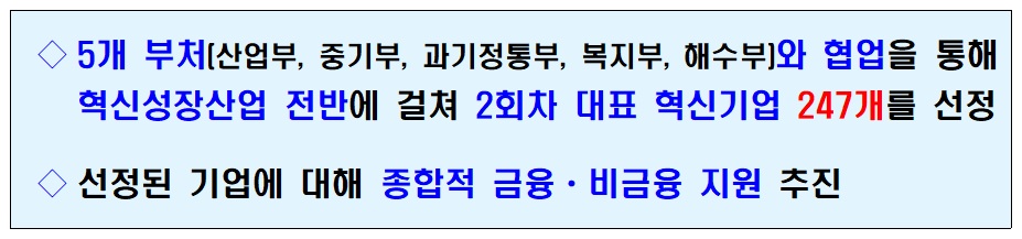 오늘(6일) 금융위원회는 국가대표 혁신기업 247개를 선정하고 이들 기업에 대해 금융·비금융을 통한 종합적 지원을 한다고 밝혔습니다.
