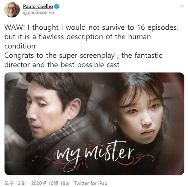 내가 정말 좋아하는 작가 파울로 코엘료가 트위터를 통해 <나의 아저씨>를 극찬했다는 걸 알게 되었다.