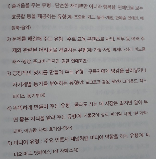 유튜브로 돈을 버는 시대에 N잡 하는 허대리는 유튜브 성공 유형을 다섯 가지 정도로 제시합니다. ‘즐거움을 주는 유형, 문제를 해결해 주는 유형, 긍정적인 정서를 만들어 주는 유형, 똑똑하게 만들어 주는 유형, 미디어 유형’입니다.