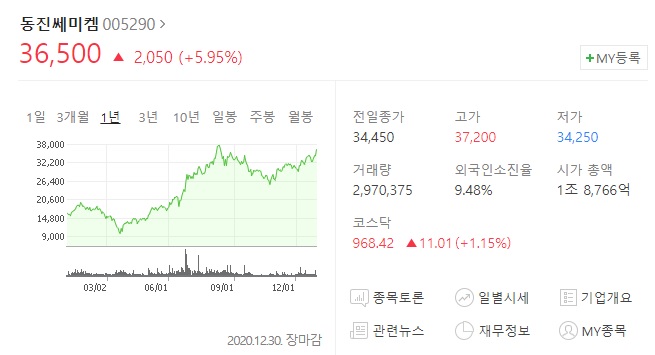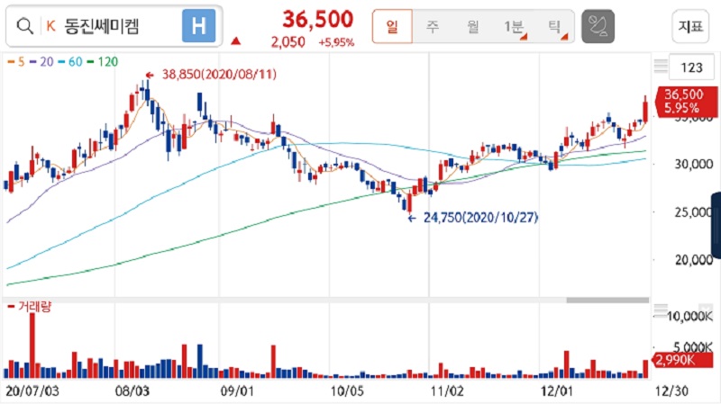 12월 28일자 매일경제 TV에서는 동진쎄미캠 주가전망을 37,000원 이상 39,000원 까지라고 했습니다.