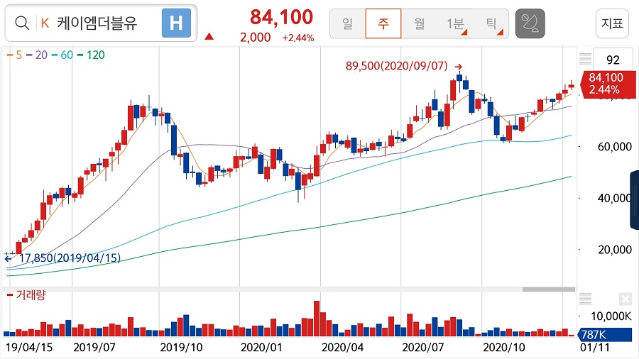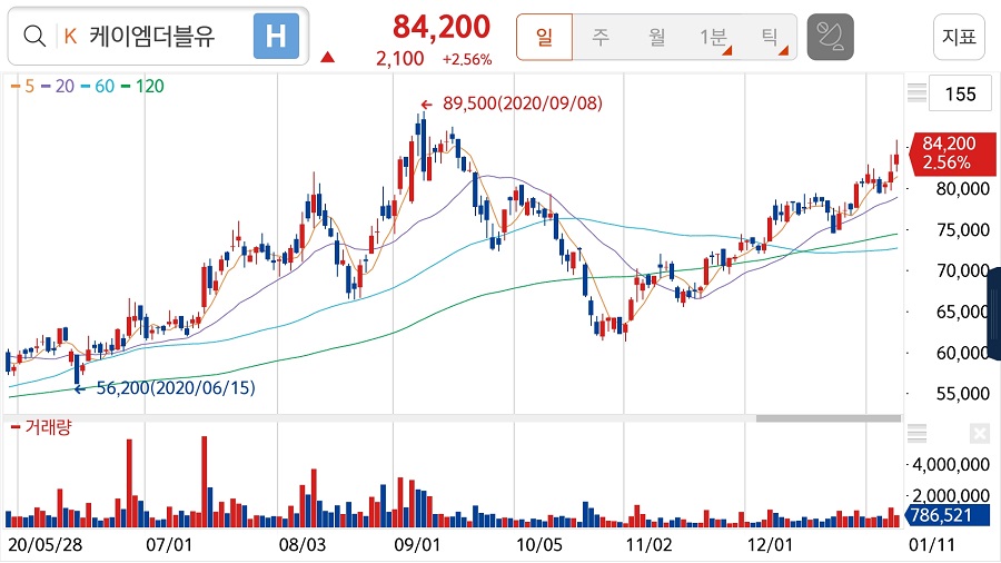 1월 11일 현재도 케이엠더블유 주가가 계속 오르고 있습니다. 수일 내로 전고점인 89,500원(2020. 9. 8.)을 뚫을 거라고 예상하는 분도 있고, 이미 주가에 실적 기대치가 많이 반영되었다고 판단하는 분도 있습니다.