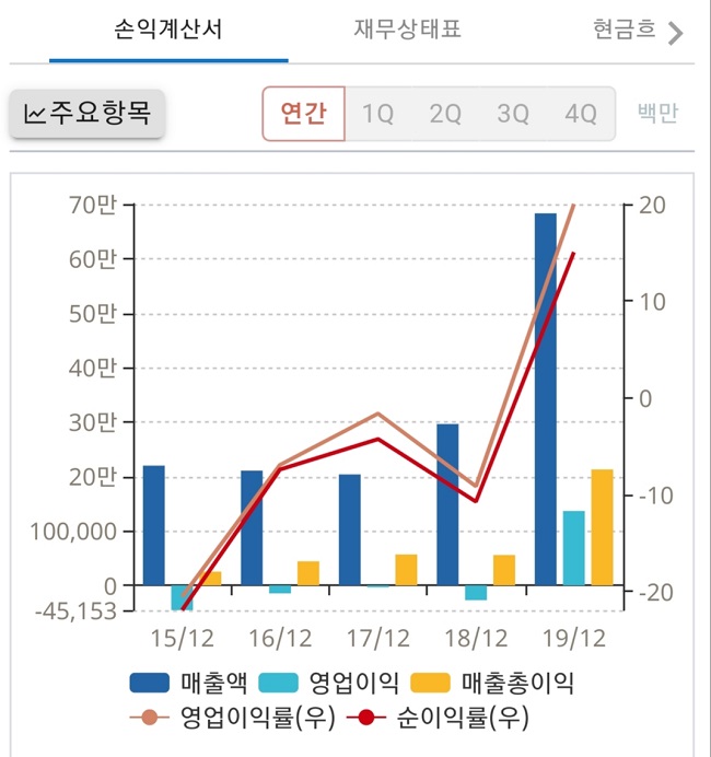 케이엠더블유 같은 통신장비주는 수주 형태로 매출이 일어납니다. 삼성전자, 버라이즌, AT&T 등 대기업에서 주문이 많으면 매출이 급증하고, 주문이 없으면 매출이 급감합니다.