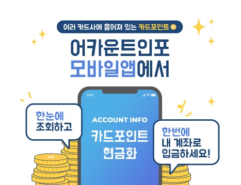 금융위원회가 제공한 여신금융협회의 '카드포인트 통합조회·계좌이체' 앱(응용 프로그램)·홈페이지 또는 금융결제원 '어카운트 인포' 앱 중 저는 어카운트 인포 앱을 사용했습니다.