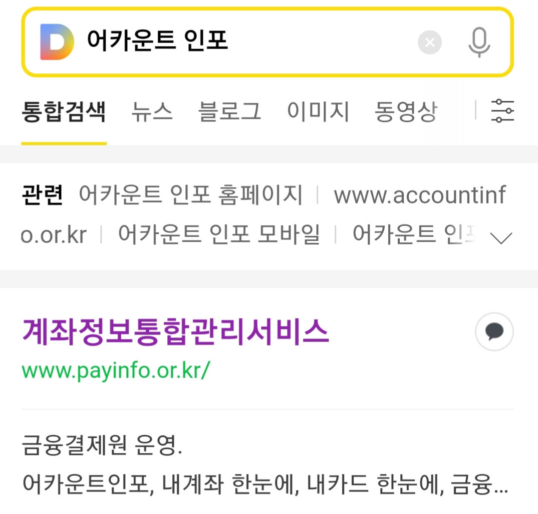 1. 어카운트 인포로 검색해서 ‘계좌정보통합관리서비스’로 접속합니다.