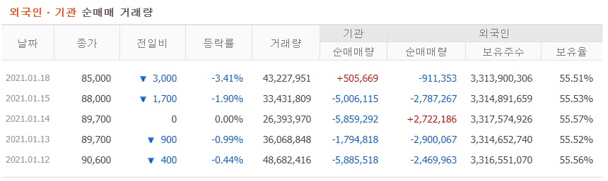 외국인들은 98만 주를 매도한 반면 개인과 기관이 70만 주를 매수했습니다.