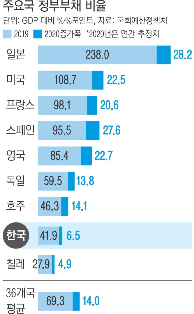 국가채무가 1000조에 육박하는 시점에서 15조 원 규모의 추경에 대해 국민적 합의를 이끌어 내야 할 거 같은데요. 코로나19 이후 우리나라 재정적자 증가율은 OECD 회원국중 두 번째로 높습니다.