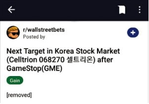 28일(미국 현지시간) 레딧의 토론방 월스트리트베츠에 “게임스톱 다음 목표물은 한국 주식 셀트리온”이라며 종목번호까지 표기했습니다.