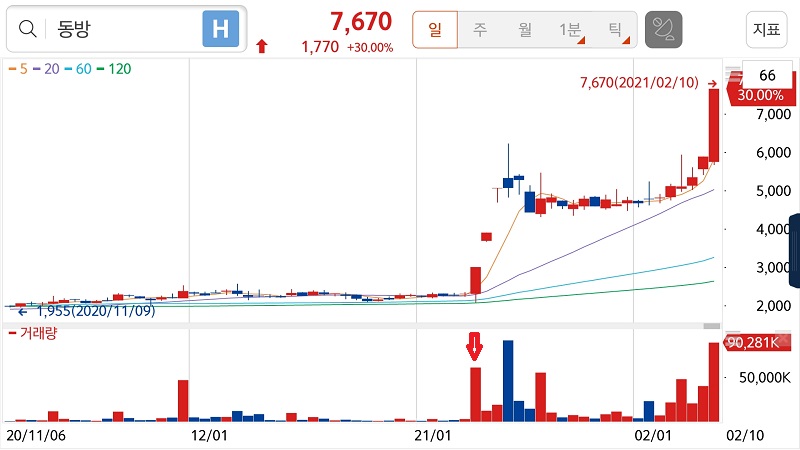 동방은 명절 전인 2월 10일, 전일보다 30% 주가 상승을 유지한 채 장을 마감했습니다. 단기간에 급등한 만큼 이미 모든 재료가 주가에 반영되었다고 보이기도 합니다.