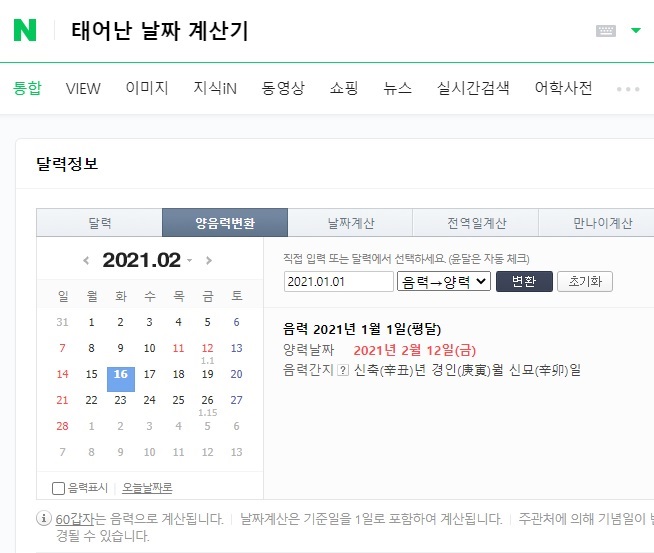 네이버 검색창에 ‘태어난 날짜 계산기’로 검색하면 다음과 같은 화면이 뜬다.