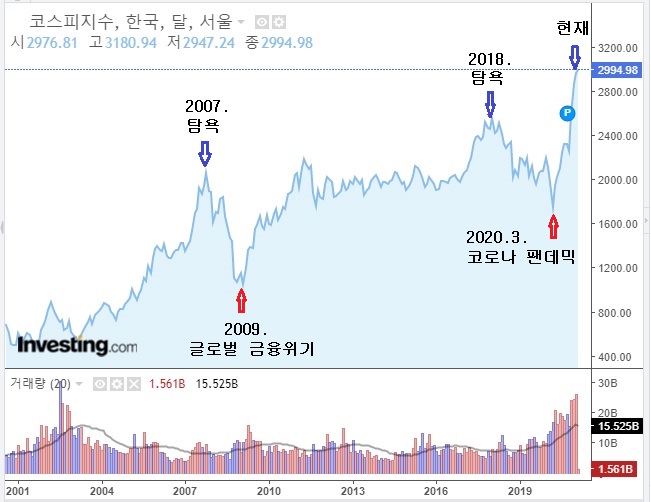 박스권에 갇혀서 박스피라는 오명을 얻은 코스피 지수가 3000을 돌파하기도 했지요.