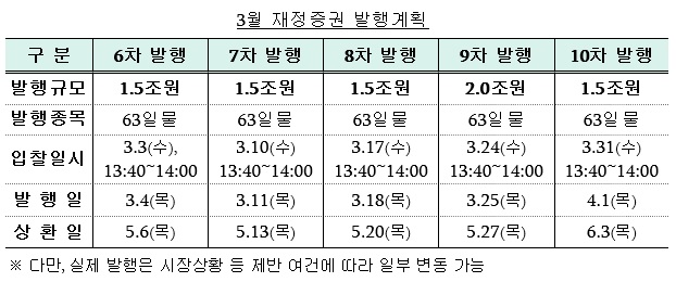 한편 기획재정부는 2021년 3월 재정증권 발행계획을 발표했습니다. 원활한 재정 집행을 지원하기 위해 3월중 8조 원의 재정 증권(63일물)을 5회에 걸쳐 발행한다고 합니다.