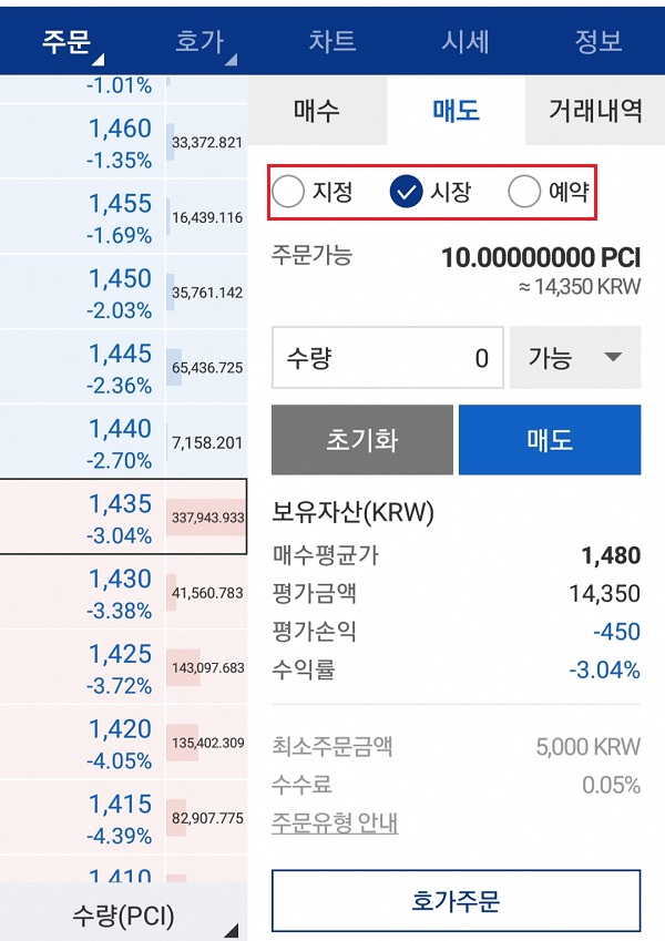 저는 10PCI만 시장가로 매도해 보겠습니다.