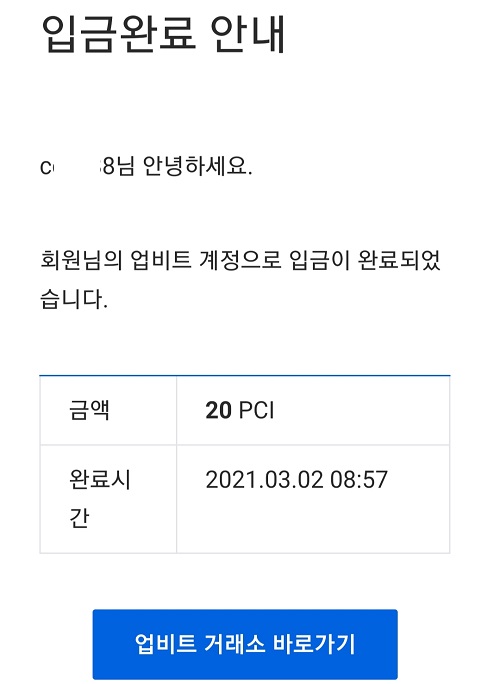 업비트에 입금된 20PCI입니다.