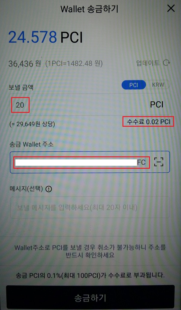 참고로 업비트에서 PCI를 PCI로 전송할 경우 금액에 상관없이 수수료가 10 PCI입니다.