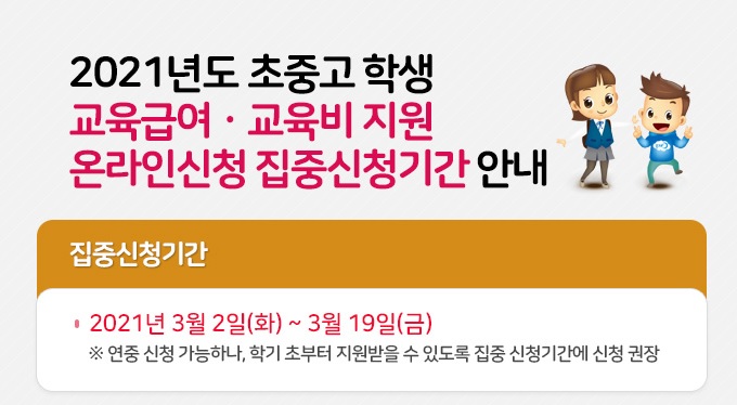 2021년 교육급여 및 교육비 지원 집중신청기간을 3월 2일(화)부터 19일(금)까지 운영합니다.
