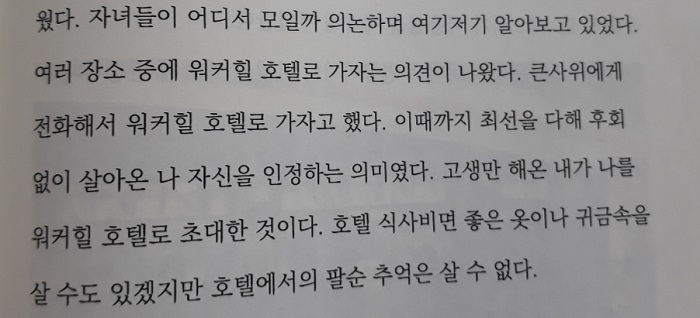‘여러 장소 중에 워커힐 호텔로 가자는 의견이 나왔다. 큰사위에게 전화해서 워커힐 호텔로 가자고 했다. 이때까지 최선을 다해 후회 없이 살아온 나 자신을 인정하자는 의미였다. 고생만 해온 내가 나를 워커힐 호텔로 초대한 것이다. 호텔 식사비면 좋은 옷이나 귀금속을 살도 있겠지만 호텔에서의 팔순 추억은 살 수 없다.’