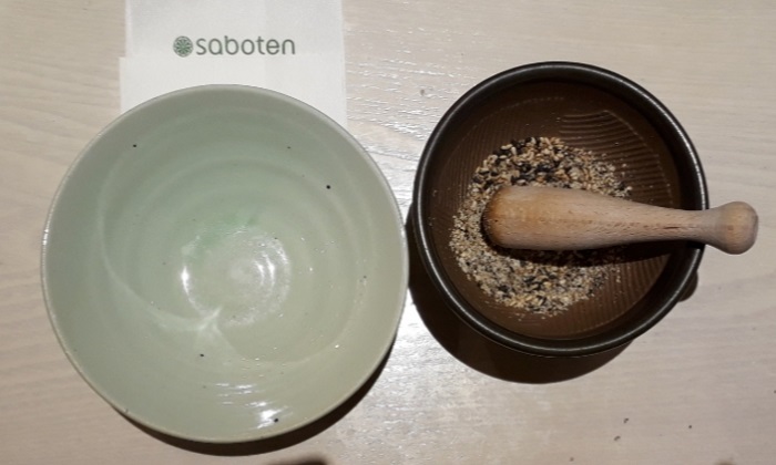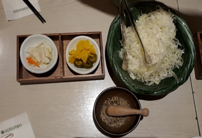 손님이 직접 갈아서 고소함을 배가 시키는 통깨와 사보텐의 명물 양배추샐러드, 장아찌류가 서빙되었다.