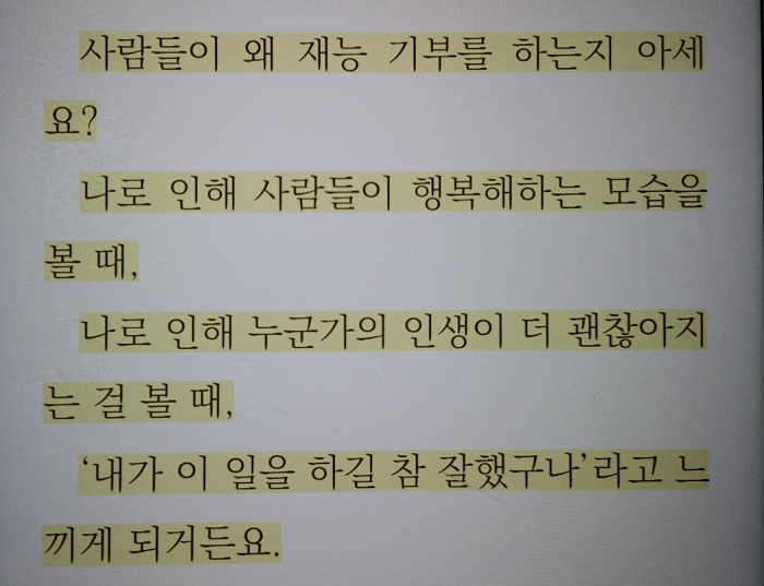 ‘사람들이 왜 재능 기부를 하는지 아세요? 나로 인해 사람들이 행복해하는 모습을 볼 때, 나로 인해 누군가의 인생이 더 괜찮아지는 걸 볼 때, ‘내가 이 일을 하길 참 잘했구나.’라고 느끼게 되거든요.’