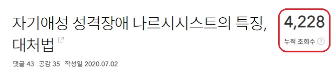 제가 올린 ‘자기애성 성격장애 대처법’이 누적 조회수 4,200회를 기록하고 있습니다. 지금도 꾸준히 검색 유입이 되고 있습니다.