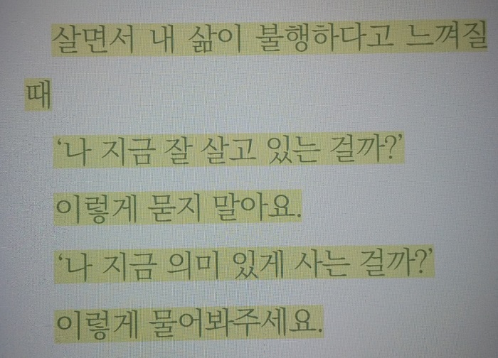 ‘행복이라는 단 하나의 감정에 내 인생을 묶어버리면 행복하지 않을 때의 내 삶은 공허하고 비루해져요. 하지만 좋은 삶의 기준을 의미로 규정하면 행복에도 의미가 있고, 불행에도 의미가 생겨요.’