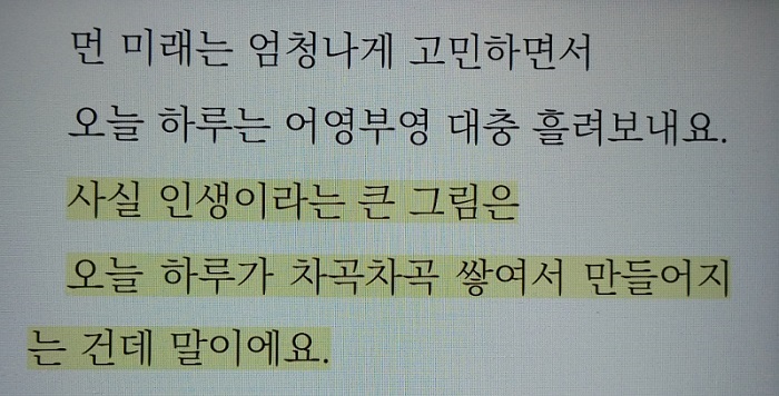 네~ 맞습니다. 꿈을 이루기 위한 실천 항목들을 매일 실천하는 겁니다. 저자는 ‘인생이라는 큰 그림은 오늘 하루가 차곡차곡 쌓여서 만들어지는 거’라고 말합니다.