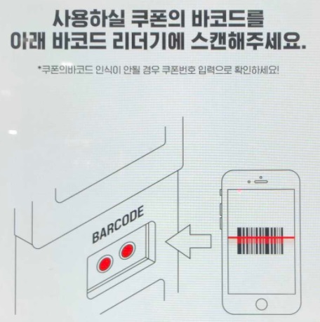 단, 키오스크 주문 처음부터 하단의 [쿠폰사용하기]버튼을 눌러 쿠폰의 바코드를 스캔해야 한다.