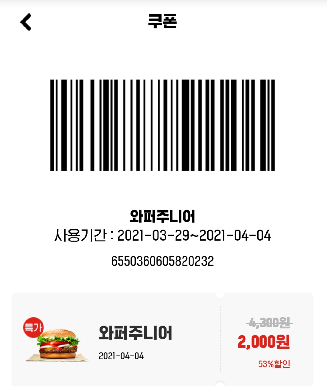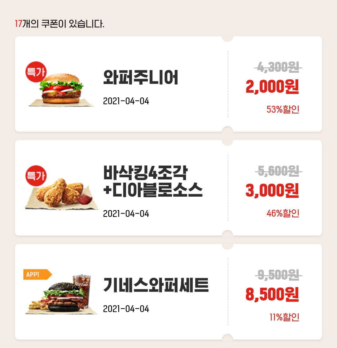 버거킹 앱을 깔고 회원으로 가입한 후 쿠폰을 사용하는 것이다.