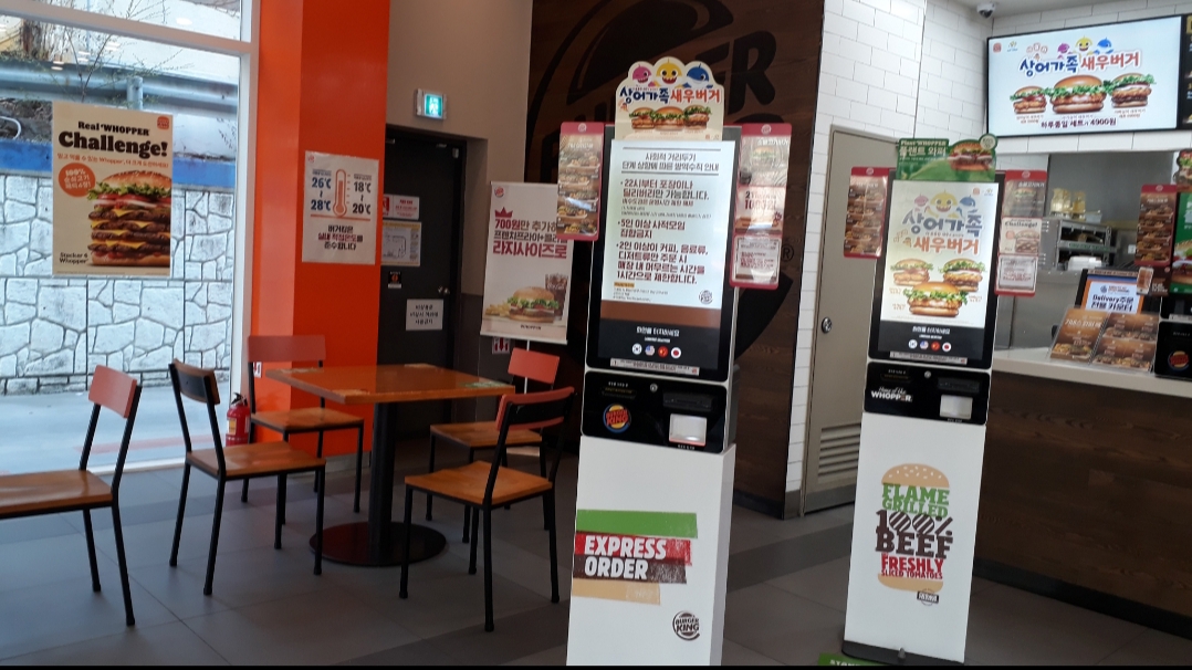 도반은 키오스크에 익숙하지 않아서 내가 주문했다. ‘통새우와퍼주니어 라지세트, 감자를 트러플프라이로 교환, 콜라를 스프라이트로 교환, 너겟킹 8조각. 테이크아웃.’