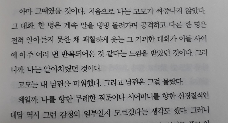 [그러니까 내가 너와 함께 살기 시작하면서 알게 된 것들을 말이야. 이를테면 시어머니가 할머니를 모시며 함께 살고, 제사를 열심히 챙기기로 한 대신 시아버지는 너의 삶에 어떤 상관도 할 수 없게 되었다는 것. 그 약속에는 나의 삶까지 포함되어 있다는 것. 그리고 그 사실을 며느리인 내게만 말해주기로 역시 약속했다는 것. 조금 더 자세히 말해볼까. 나는 그날 집에 돌아가는 길에 그 내용이 담긴 장문의 문자를 받았다. 시어머니는 글 말미에 이렇게 썼다. ‘그러니까 앞으로 제사에 오지 않아도 된단다.’ 그녀는 강조했다. ‘정우는 다 모르게 해줘.’]