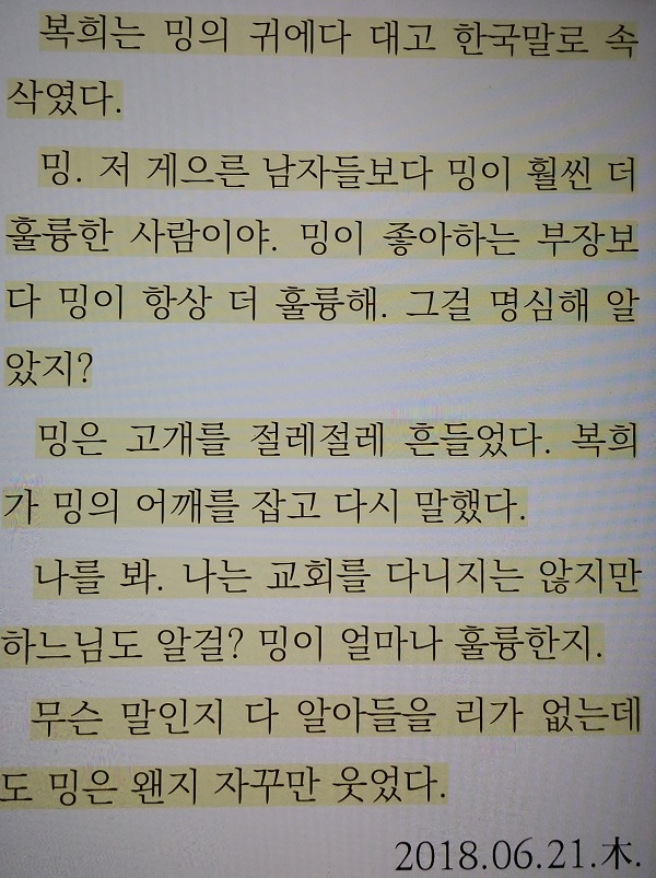 ‘걔는 나를 만나고 한국에 대한 관심이 많아졌어. 책과 인터넷으로 한국에 대해 닥치는 대로 정보를 수집하고, 도서관에서 한국인처럼 생긴 사람을 보면 괜히 말을 걸었대. 내가 좋아하는 산울림의 <너의 의미>를 걔한테 알려줬어. 걔가 그 노래를 자기도 꼭 부르고 싶다고 말했어. 혼자서 그 노래를 몇 번이라 돌려들으며 영어로 발음을 적더라. 그러고는 통째로 다 외워버렸어. 가사가 무슨 의미인지도 다 공부해왔어. 나랑 이 노래를 꼭 같이 부르고 싶다고 말했어.’