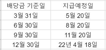 우리나라 기업 대부분은 년 1회 배당금을 지급하는 반면 미국 주식은 분기별, 월별로 지급하는 기업도 많다고 하네요.